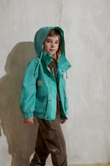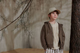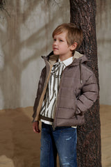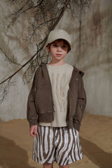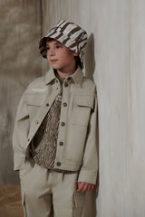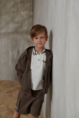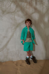 Близость к дикой природе в полночь может быть опасной. Но идея привлечь внимание к образам коллекции через фотореалистичные изображения аравийской фауны не является основной. Создать выразительный графический рисунок, напоминающий одновременно и узор «Зебра», и динамичные повороты внедорожников на дюнах, и величественные горные хребты далекого Килиманджаро, показалось более привлекательной задачей, позволяющей создать стильный гардероб активного и энергичного мальчика. Значимыми элементами коллекции стали трикотажные изделия открытого кроя с легкой потертостью, покрытые лаком, создающие эффект винтажности. Футболки, поло, джемперы, брюки-карго и другие необходимые атрибуты детской одежды для прогулок, путешествий и активного отдыха выглядят как просоленные или выгоревшие на солнце, потертые вещи, символизирующие комфорт, расслабленность и непринужденность. Исключением является лишь стильный блейзер из орнаментальной ткани. Лен и хлопок в составе этой куртки и других текстильных изделий создают уникальные тактильные ощущения, которые могут дать только натуральные материалы.